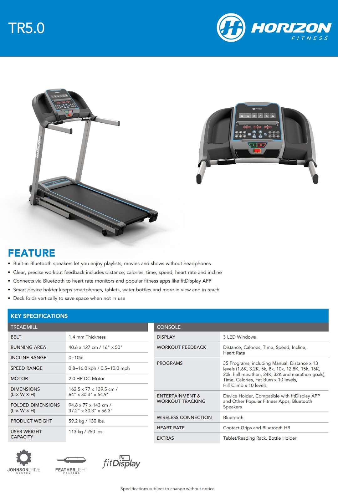 | Mostrar | 3 ventanas LED | | Entrenamiento / Comentarios en pantalla | Distancia, calorías, tiempo, velocidad, frecuencia cardíaca | | Programas / Entrenamientos | 35 programas, incluyendo manual, distancia x 13 niveles (1.6K, 3.2K, 5k, 8k, 10k, 12.8K, 15k, 16K, 20k, media maratón, 24K, 32K y metas de maratón), tiempo, calorías, quema de grasa x 10 niveles, Hill Climb x 10 niveles | | Ritmo cardiaco | Puños de contacto y Bluetooth HR Dimensiones (L x W x H): 162,5 x 77 x 139,5 cm Dimensiones plegables ( Largo × ancho × alto):94,6 x 77 x 143 cm Usuario Capacidad de peso: 113 kg